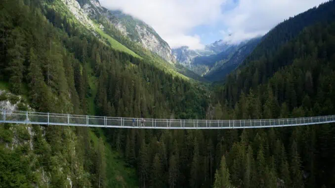 Die Überquerung der Höhenbachschlucht nahe Holzgau ist nichts für schwache Nerven, aber doch ganz ungefährlich. Von den blühenden Wiesen am Gföllberg bis zum Sonnenplateau Schiggen führt die Hängebrücke, die mit 200 Meter Länge und einem Meter Breite mehr als 100 Meter über dem Boden schwebt. Dabei ist das 2012 eröffnete Bauwerk die höchste, unentgeltlich zugängliche Fußgängerbrücke in Österreich und bietet freien Blick auf den Simmswasserfall. Im 19. Jahrhundert künstlich angelegt, gilt die Kaskade als bedeutendste Sehenswürdigkeit von Holzgau.
