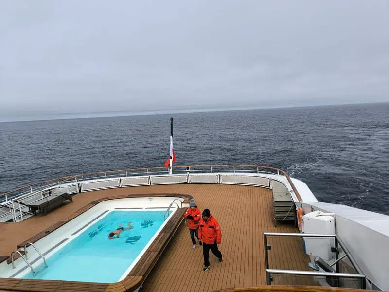Nach dem Ablegen in Ushuaia beginnt die Überquerung der Drake-Passage, die berüchtigt ist für ihre stürmischen Gewässer. Doch uns war sie gnädig, und die zwei Tage auf See konnten genutzt werden, um die Annehmlichkeiten und Aktivitäten des Schiffs L´Austral der französischen Reederei Ponant zu genießen. Durch Vorträge von Experten über die Antarktis und ihre Tierwelt, wird die Vorfreude auf die bevorstehende Reise gesteigert.