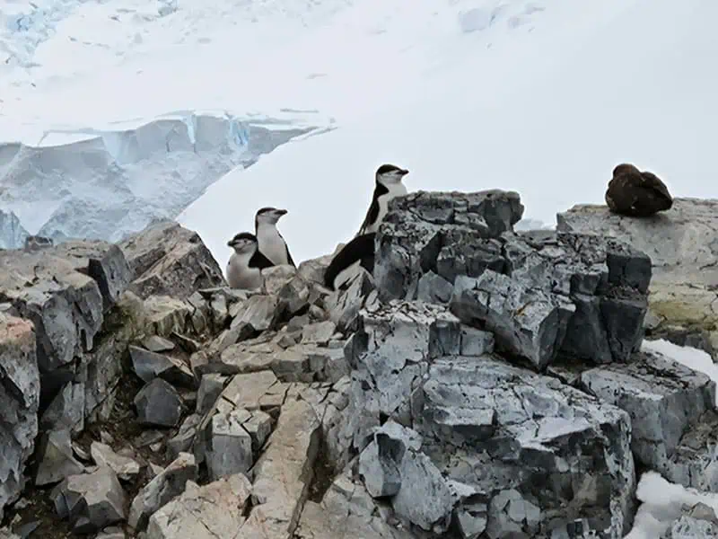 Oben angekommen sind überall Brutstätten von Pinguinen auf nacktem Felsgestein, denn nur die Spitzen der Berge sind ohne Schnee und Eis, und daher als Brutstätten geeignet. Skuas, eine Raubmöwenart, lauern in der Nähe, einer hat sich sogar ohne Skrupel direkt hinter der Kolonie platziert, darauf wartend, dass die Pinguine abgelenkt werden. Jetzt dürfen die Pinguine keinen Fehler machen, denn Eier und Pinguinküken zählen zu deren Lieblingsbeute.
