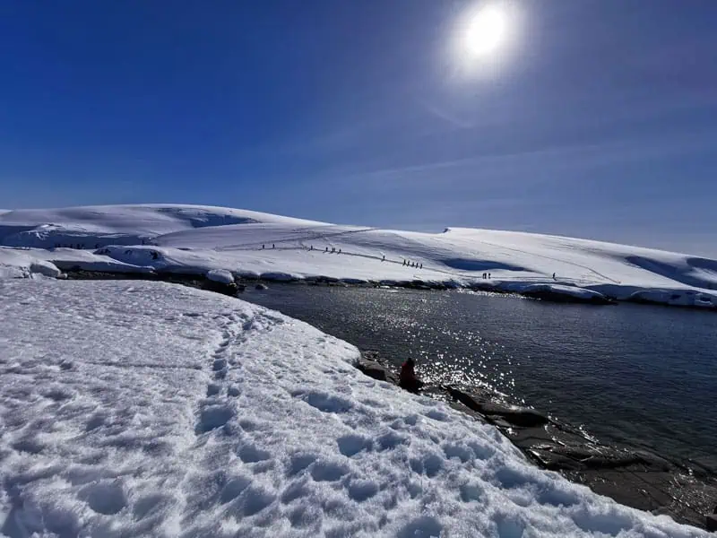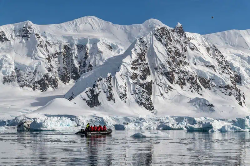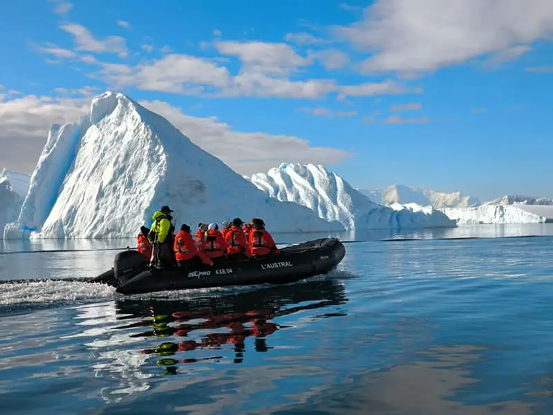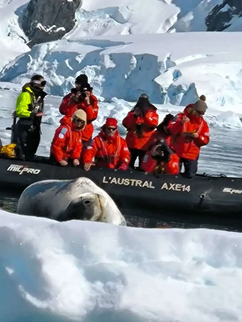 Am Nachmittag geht es zu einer Zodiac- oder alternativ einer Kajak-Tour durch einen Traum aus Schnee und Eis in Blau und Weiß. Geschickt weichen die Bootsführer den gefährlich kantigen Eisschollen aus, die überall im tiefblauen Wasser treiben, während wir die hochaufragenden Berge um uns herum bewundern und Ausschau nach Orcas, Seeleoparden, Robben Pinguinen und Buckelwalen halten.