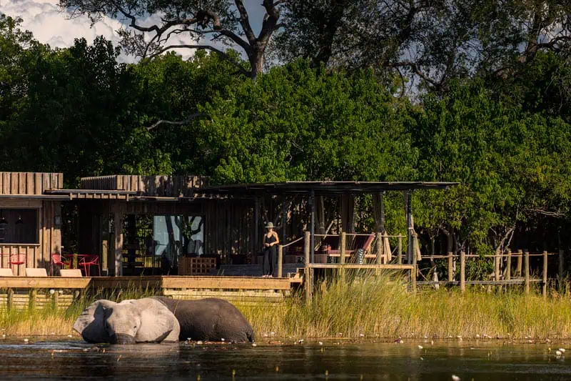 Beim DumaTau Camp in Botswana schwimmen riesige Elefantenherden vor der Terrasse vorbei