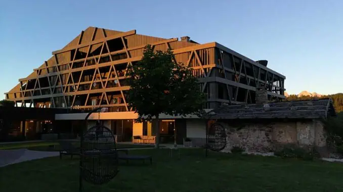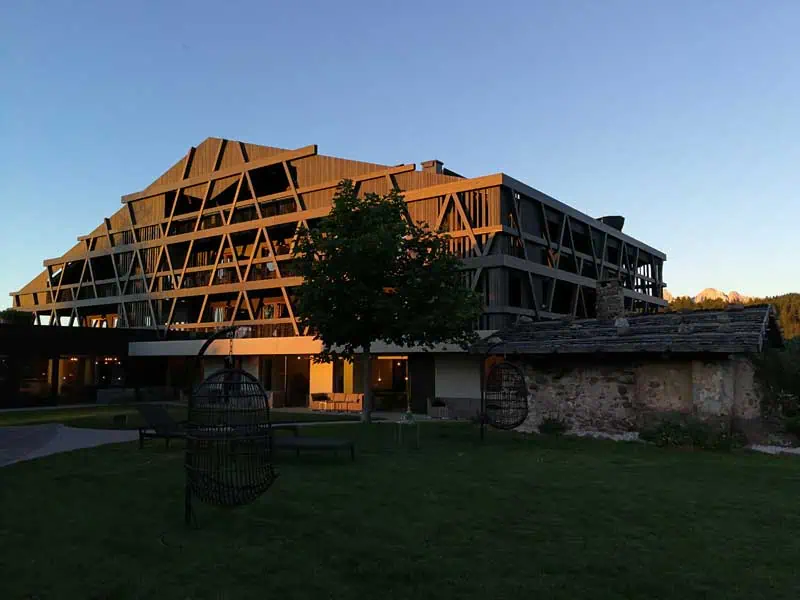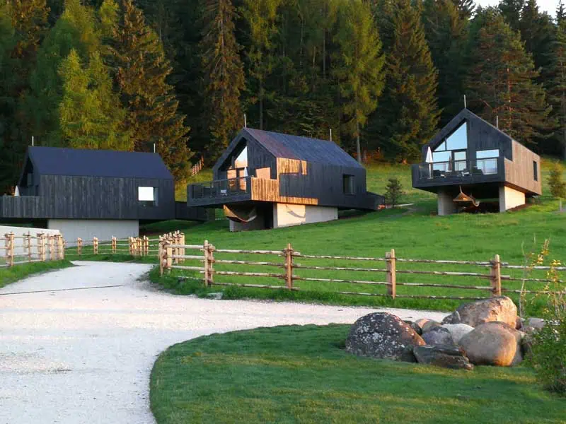 Ins Auge fallen nur noch drei Chalets aus dunklem Holz auf einem Hang am Waldrand, gebaut auf Betonstützen, zwischen denen Hängematten gespannt sind. Über dem Gelände thronend geben sie durch ihre großzügigen Glaselemente atemberaubende Blicke auf Schlern, Rosengarten und Latemar frei. Die ganz in hellem Holz gehaltenen Räume sind modern, gemütlich und komfortabel eingerichtet. Auf der großzügigen Holzterrasse steht eine Außenbadewanne, wo man die ganze Aussicht auch bei einem Bad zu zweit genießen kann.