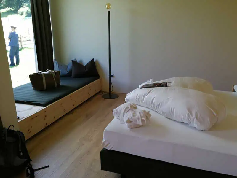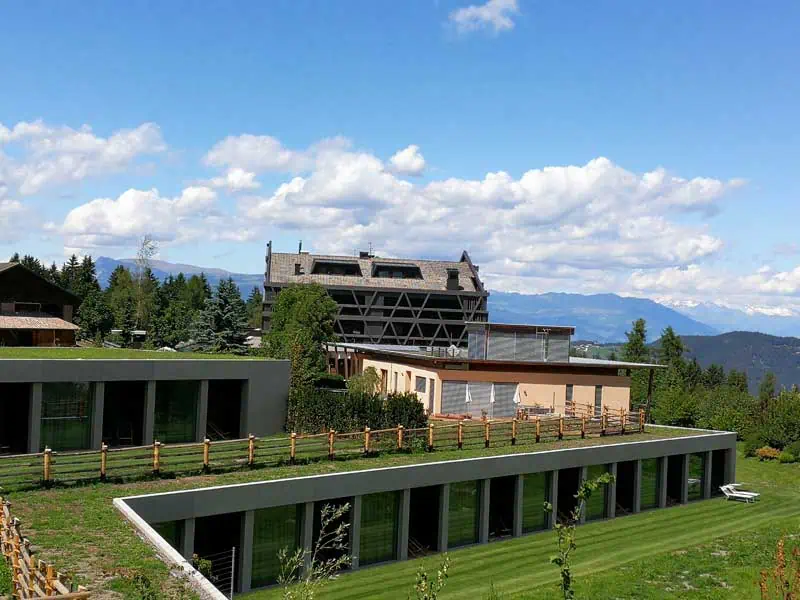 Ganz anders die Nebengebäude, die sich schon fast in der Erde verstecken und trotzdem alle mit dem Hauptgebäude verbunden sind. Die beiden neuen Zimmertrakte sind so gebaut, dass sie auf der einen Seite einen großzügigen Blick auf die Bergwelt freigeben und auch alle eine Terrasse mit Rasen haben, aber ansonsten harmonisch mit der umgebenden Landschaft verschmelzen.