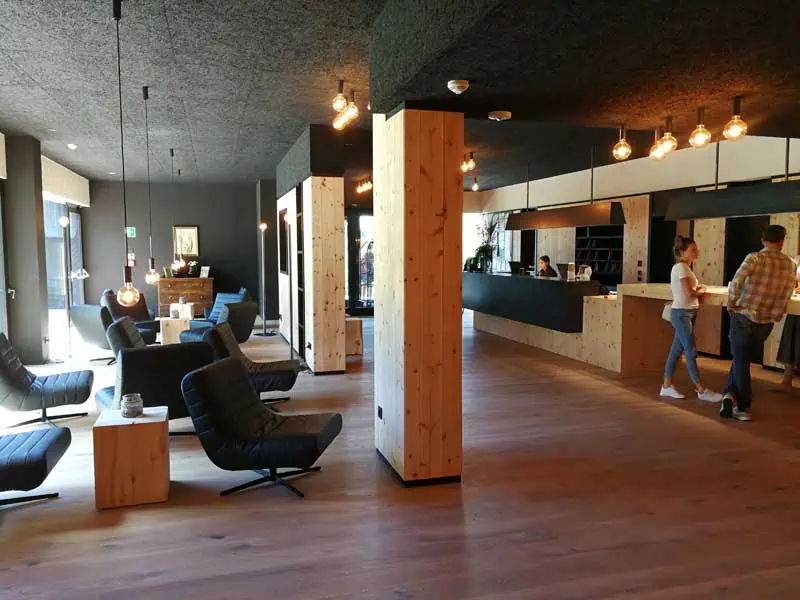Dass dieses Hotel ein besonderes Konzept hat, bemerke ich auch schon bei dem Betreten des offen gestalteten Foyers, welches wie die Hotelbar, das Panoramarestaurant sowie die Kamin-Lounge, in alpinem Design hell mit schwarzen Akzenten gestaltet wurde. Wohlriechender Räuchergeruch von Kräutern fällt mir ebenfalls direkt angenehm auf.