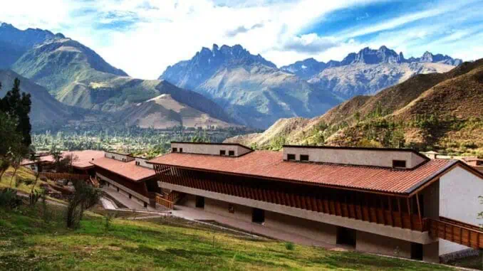 Als die Lodge vor uns inmitten der Maisfelder auftaucht, sehen wir, dass sie ideal in die Landschaft eingepasst und auch möglichst im Einklang mit der Natur gebaut wurde. Die einzigartige Bauweise spiegelt die kulturellen Wurzeln in der Außengestaltung der Lodge wieder. Naturmaterialien wie Holz sowie die traditionelle Verkleidung der Mauern mit Lehm und der einheimischen Pflanze Jahuacollay zeigen die Nähe zur Natur und zur reichen Geschichte der Region.