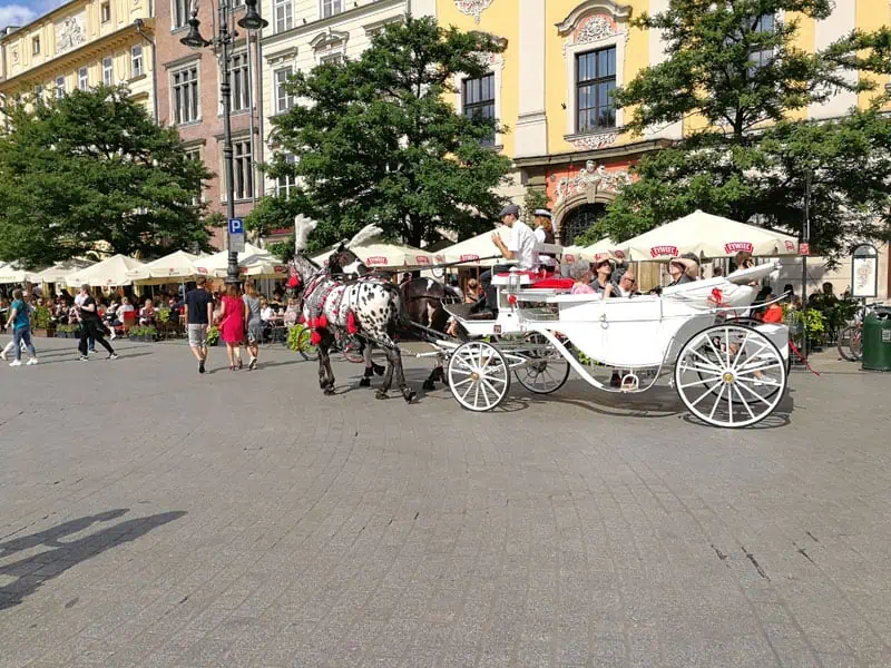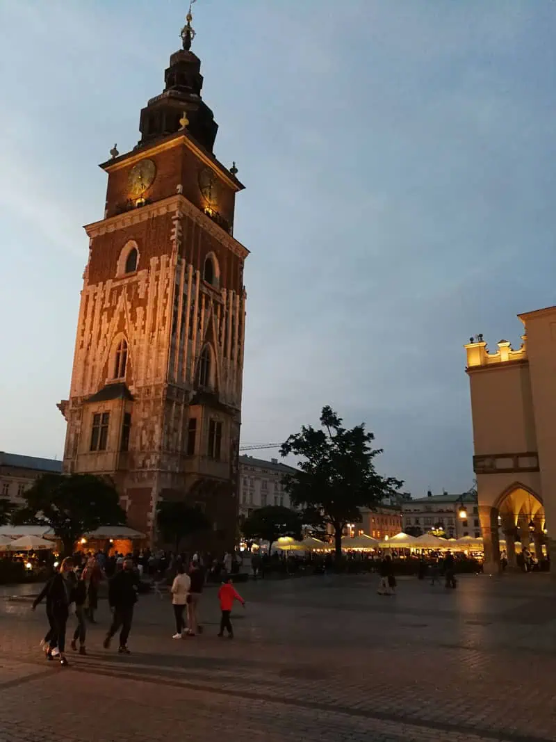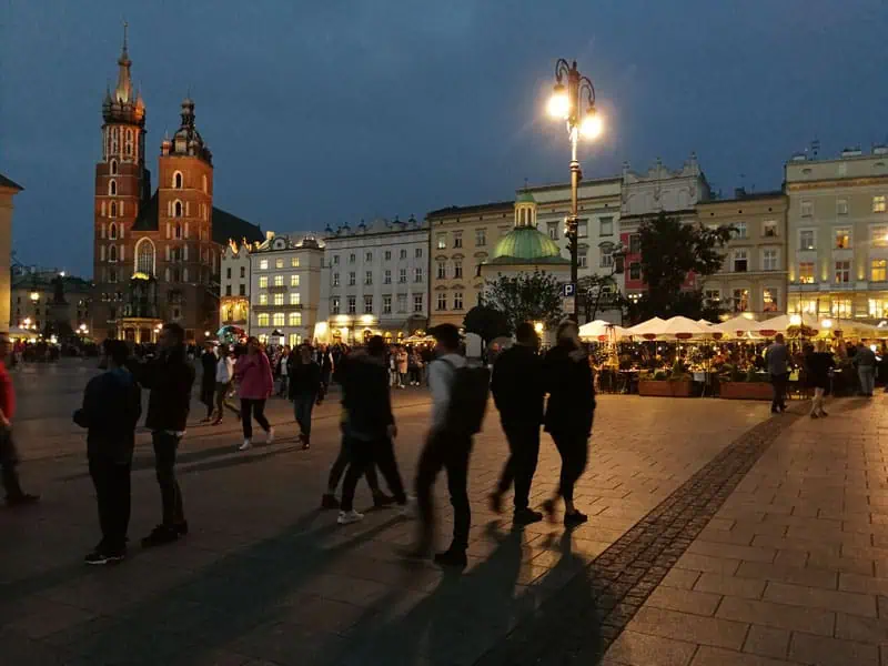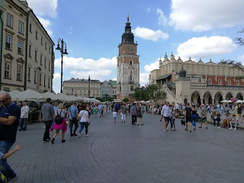 Hier ließen bereits polnische Herrscher zahlreiche Zeremonien, Krönungen und Hinrichtungen ausrichten. Heute genießen Einwohner wie auch Besucher vom frühen Morgen bis in den späten Abend das quirlige Leben auf diesem größten mittelalterlichen Platz in ganz Europa in vollen Zügen. Auf dem Markt, in den Geschäften, den Kneipen, Restaurants und vor allen Dingen Freiluftcafés herrscht buntes Treiben, immer zu jeder vollen Stunde begleitet von dem seit Jahrhunderten üblichen Trompetensignal vom höchsten Turm der zweitürmigen Marienkirche. Und auch heute kommt es nicht vom Band, sondern wird stündlich live trompetet. Doch darf man sich nicht wundern, wenn das Trompetensignal immer abrupt abbricht. Der Grund, es dient als Erinnerung an den tapferen Trompeter, der die Krakauer Bürger vor einem Angriff der Tataren warnen wollte, jedoch währenddessen von einem Pfeil getroffen wurde und verstarb.