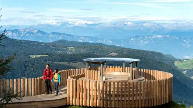 In Obereggen, nur fünf Minuten von der Bergstation des Panorama-Sessellifts Obereggen-Oberholz entfernt, befindet sich auch auf dem Themenweg latemar.panorama die Aussichtsplattform „latemar.360°“ mit einem spektakulären Rundumblick auf die Bergzüge von Lagorai und Brenta/Adamello über Königsspitze/Gran Zebrù und Ortler bis hin zu den Ötztaler, Stubaier und Zillertaler Alpen.