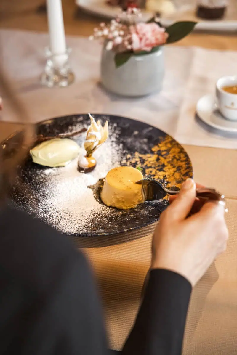 Kulinarisch hat das Hotel auch Einiges zu bieten: Für Küchenchef Wofgang Lenz und sein Team sind Qualität, Regionalität und Saisonalität oberstes Gebot. So kommt das Gemüse vom paar Kilometer entfernten Händler des Vertrauens und Fisch und Fleisch von einem Fischzüchter und vom Metzger der Region. Das Wildfleisch kommt sogar aus der eigenen Jagd in Marienberg.