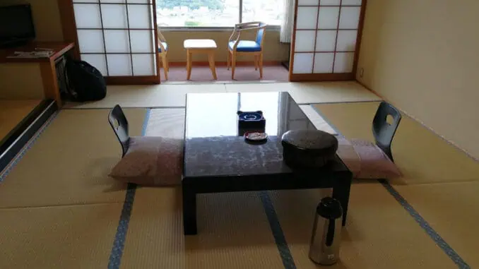 Im Raum steht auf den Tatami-Matten ein japanischer Tisch mit vier Sitzkissen. Auf dem Tisch stehen heißes Wasser und eine Teedose mit allen benötigten Utensilien für die Teezubereitung bereit. Manchmal wird in einer zweiten Thermoskanne kaltes Wasser angeboten. Mit japanischen Sendungen im Fernsehen und manchmal einem W-LAN Anschluss im Zimmer kann man sich die Zeit am Abend vertreiben.