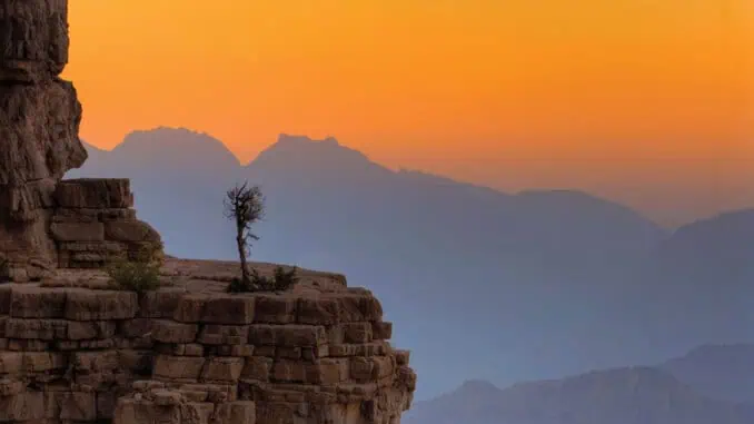 Kurvenreiche Straßen führen über steile Pisten, für die ein Fahrzeug mit Allradantrieb notwendig ist, hinauf ins Hajar Hochgebirge. Hier treffen Besucher auf die zwei bekanntesten Berge des Sultanats: Jabal Akhdar ist für seine malerischen, in den Felsen gehauene Terrassengärten berühmt und wird daher auch der „Grüne Berg“ genannt. Und Jabal Shams, der mit seinen 3.075 Metern als höchster Punkt des Landes gilt. Beide Berge sind von Wanderwegen durchzogen, die mitunter an eindrucksvollen Klippen und Felsvorsprüngen entlangführen und majestätische Ausblicke über tiefe Schluchten bieten; im Falle des Jabal Shams auf den großen Canyon des Wadi Nakhar. Auch kleine Dörfer liegen verstreut zwischen den Bergen und versprechen lohnende Begegnungen mit Einheimischen. Inmitten der kargen Landschaft fließt das Gebirgswasser durch Steinkanäle in die Gärten. Granatäpfel, die von den lokalen Stämmen zum Kauf angeboten werden, sind eine willkommene Erfrischung an heißen Tagen. Im Frühling können Reisende der aufwendigen Ernte der duftenden Damaszener-Rosen beiwohnen.